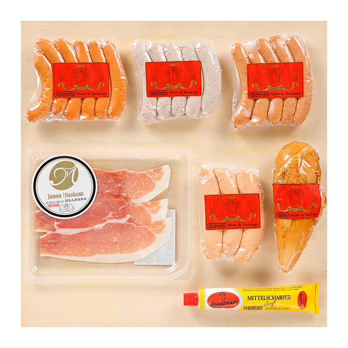 生ハムの他にも、育風堂のラインナップで人気のウインナー、粗挽きポーク100%の「ゲルダーレンダー」。フランクフルト地方のウィンナーで、細挽きのベーシックな味わいの「フランクフルター」。赤ワインとパセリが入ったノンスモークの白い粗挽きウィンナー「サルシッチャ」は、マイルドな味で女性に人気。ポトフにもおすすめです。辛口の粗挽きウィンナー「チョリソ」はジューシーな肉感で辛味が後を引き、ビールのお供にもぴったり。そして地元の銘柄鶏、赤城鶏のスモークなど、<育風堂精肉店>で人気のハム・ソーセージが詰合せになったこちらのセット。マスタード付きで、オードブルやお酒のおつまみにもぴったり。群馬みなかみ発、こだわりハム工房の絶品グルメは、ご自宅用にも、お世話になった方への贈り物や、季節のギフトにもぜひおすすめです。
