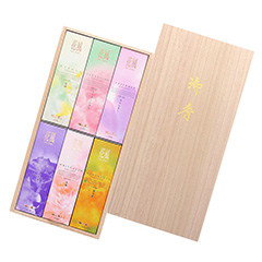 専門家が天然白檀と原料を厳選し、調合した上質な9種類のお香と有田焼の陶磁器製香皿を詰め合わせました。桐箱入りでご進物にもオススメです。〈香彩堂〉いにしえの人々が生み出し、今日まで絶えることなく受け継がれてきた文化と四季折々に自然の風情が感じられる街、京都。その京都から、潤いと癒しの素晴らしい時間、空間を創出してくれる京ならではの香りをお届けします。ストレスの多い現代社会において、ホッとひと息つける時間を持つことは、すごく大切なこと。私たちは、「暮らしに香りで彩と癒しと潤いを」をテーマに心地良い時間と空間づくりのお手伝いをさせていただきます。