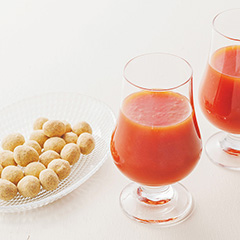 旨みをしっかり引きだした大豆を深煎りローストした煎り大豆と風味豊かなきな粉をコーティングした豆菓子「びばいきなこ豆」と、桃太郎とアイコを樹上完熟で収穫した完熟トマト100%「トマトジュース」のセットです。きなこ豆はそのままお茶菓子やヨーグルトなどのトッピングとしてもおいしくいただけます。