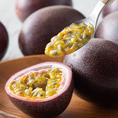沖縄本島の最南端・糸満市にあるエコファーマー、「沖縄情熱農園」から無農薬の極上パッションフルーツをお届けします。その名も「情熱の女神」と名付けられたこの果実は、園主の山城秀正さんが試行錯誤のうえ、10年の歳月をかけて育て上げた逸品。天然肥料で土壌細菌を活性化させるという独自の栽培法により、平均糖度17~19度、L~3Lサイズ、等級「秀」を実現した、味も見た目も最高品質のパッションフルーツです。ぎっしり詰まった果肉をスプーンですくい、ひと口食べてみてください。上品で甘い香りとともに甘酸っぱい濃厚な果汁が口中に広がって、リフレッシュ気分満点。カラダ中に元気がみなぎります。パッションフルーツはβーカロチンや葉酸、ビタミンCなど“マルチビタミン”と呼ばれるほど豊富な栄養素を含んでいますが、食べる際は、できましたら種を噛んでお召し上がりください。種子の中にはポリフェノールがブドウの7000倍も含まれていて、高い抗酸化作用が期待できます。「日本の極み」TOPへ
