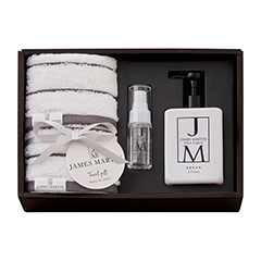 清潔さが求めらえる飲食業の現場からうまれたライフスタイルブランド「ジェームズマーティン」。食品成分のみで作られたフレッシュサニタイザーは外出時にも便利な携帯用。さらに、毎日の皿洗いによる肌の負担を解消するために開発されたディッシュリキッドと、抗菌加工の施されたモノトーンのボーダーのフェイスタオル2枚を詰合せたギフトセットでお届け。