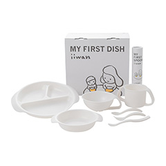 産業用に栽培されるデントコーンという品種のトウモロコシのでんぷん(糖)に乳酸菌を加えてできる「ポリ乳酸」で作られた食器セットです。食器はすべて曲線デザインで角がなく、すべすべの手触りです。離乳食初期から幼児食まで段階的に使えるお皿4点とスプーン・フォーク、ファーストスプーンを含む7点セットになっています。食器のカラーにはそれぞれ意味が込められており、ホワイトは純粋でまっすぐ、やさしい子になって欲しいという想いが込められています。