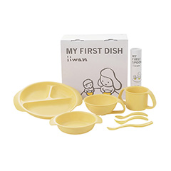 産業用に栽培されるデントコーンという品種のトウモロコシのでんぷん(糖)に乳酸菌を加えてできる「ポリ乳酸」で作られた食器セットです。食器はすべて曲線デザインで角がなく、すべすべの手触りです。離乳食初期から幼児食まで段階的に使えるお皿4点とスプーン・フォーク、ファーストスプーンを含む7点セットになっています。食器のカラーにはそれぞれ意味が込められており、イエローは元気で明るく、いつまでも笑顔でいられる子になって欲しいという想いが込められています。