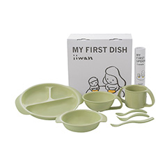 産業用に栽培されるデントコーンという品種のトウモロコシのでんぷん(糖)に乳酸菌を加えてできる「ポリ乳酸」で作られた食器セットです。食器はすべて曲線デザインで角がなく、すべすべの手触りです。離乳食初期から幼児食まで段階的に使えるお皿4点とスプーン・フォーク、ファーストスプーンを含む7点セットになっています。食器のカラーにはそれぞれ意味が込められており、グリーンはすこやかにいきいきと、自然を感じて育ってほしいという想いが込められています。