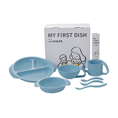 産業用に栽培されるデントコーンという品種のトウモロコシのでんぷん(糖)に乳酸菌を加えてできる「ポリ乳酸」で作られた食器セットです。食器はすべて曲線デザインで角がなく、すべすべの手触りです。離乳食初期から幼児食まで段階的に使えるお皿4点とスプーン・フォーク、ファーストスプーンを含む7点セットになっています。食器のカラーにはそれぞれ意味が込められており、ブルーは空のように広い心で、海のような深い思いやりをもって強くやさしく育ってほしいという想いが込められています。