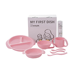 産業用に栽培されるデントコーンという品種のトウモロコシのでんぷん(糖)に乳酸菌を加えてできる「ポリ乳酸」で作られた食器セットです。食器はすべて曲線デザインで角がなく、すべすべの手触りです。離乳食初期から幼児食まで段階的に使えるお皿4点とスプーン・フォーク、ファーストスプーンを含む7点セットになっています。食器のカラーにはそれぞれ意味が込められており、ピンクはやさしくしなやかに愛を感じて育ってほしいという想いが込められています。