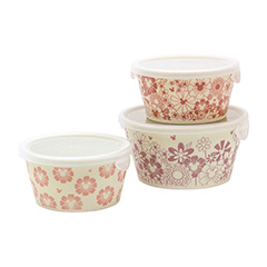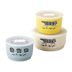 冷蔵庫からレンジへ、そしてそのままテーブルにも並べられる、おしゃれなレンジパック。3個セットは本体が磁器製。大中小と重ねて収納もできて便利。