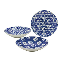 ミッキーマウスと仲間たちのすました表情のフェイスアートが、松皮菱、破れ籠目、梅といった日本の伝統和柄と組み合わされ、呉須(ごす)の深い色合いで表現した器です。