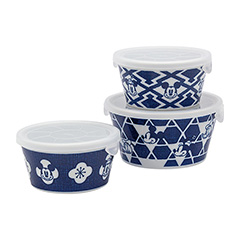 ミッキーマウスと仲間たちのすました表情のフェイスアートが、松皮菱、破れ籠目、梅といった日本の伝統和柄と組み合わされ、呉須(ごす)の深い色合いで表現したレンジパックです。