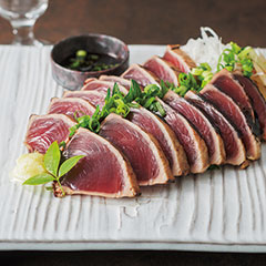 脂ののった鮮度の良い鰹の表面を一気に高温で炙り、旨みを閉じ込めました。高知県産のゆずと直七すだちをブレンドしたポン酢は、鰹との相性ばっちりです。「日本の極み」TOPへ