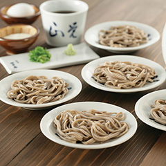 丸引きした粉で打つ蕎麦は黒く、高い香りと独特の食感、蕎麦本来の味がします。白磁の小皿に分けて食す但馬出石様式で本格的に。