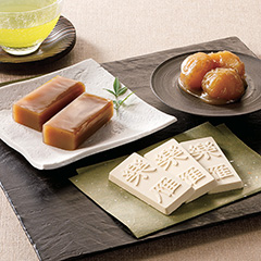自社工場で仕込んだ栗あんと栗粒を合わせた栗鹿ノ子、なめらかな食感で香ばしい風味の楽雁、栗あんだけで作った栗羊羹の詰合せです。