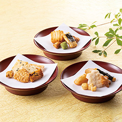 かわいらしく個性の光るおいしいあられ・お煎餅を「花」「水」「緑」3種の小袋に詰め合わせた人気のセットです。