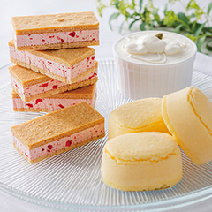 プティ・メルヴィーユのスウィーツを一度に味わえる贅沢なセットです。定番のメルチーズと北海道のバターをたっぷり使用したいちごのバターサンド、くりりんかぼちゃを使用したかぼちゃプリンが楽しめます。いちごのバターサンドは北のハイグレード食品2024に認定されました。