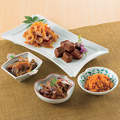 まぐろとあさりは甘めのやわらかい佃煮に、きのこはさっぱり煮に、れんこんはしょうがをきかせて炊きあげました。鮭そぼろは白ごまたっぷりでお茶漬けにもおすすめの人気佃煮5種セットです。