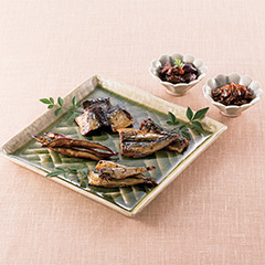 煮魚感覚で食べられる「にしんうま煮」、こっくり濃厚な甘みで骨までたべられる「さんま蒲焼」、「いわし甘露煮」、「焼なご」。甘辛のたれがしみ込んだ「あさりしぐれ」と、素材の旨みを引き立てあう「しいたけあさり」の6種です。