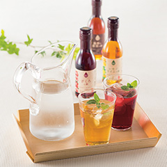 果汁を発酵させた果実酢に果汁を加えた「フルーツビネガー」の5種セットです。水割り・炭酸割り、ヨーグルトやアイスクリームにかけたりとさまざまなお料理にもお試しください。