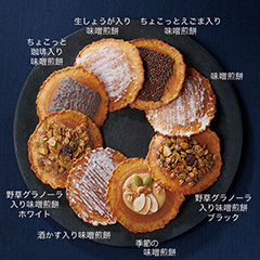 岐阜県飛騨市で明治41年(1908)創業の<井之廣製菓舗>は味噌煎餅の専門店。3年間じっくり熟成した自家製味噌で作る味噌煎餅は一枚一枚手作りで、パリっとした歯応えと程よい甘みが特長。8種のバリエーションが楽しめるアソートセットです。