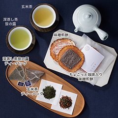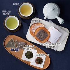岐阜県飛騨市の<井之廣製菓舗>と岐阜県高山市の<なべしま銘茶>のコラボ商品です。飛騨の名物味噌煎餅に相性抜群の日本茶と玄米茶をセットにしました。