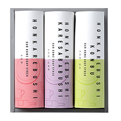 洒落たブック型のパッケージに本枯節の旨みを活かした3種の「だしパック」を詰め合わせました。