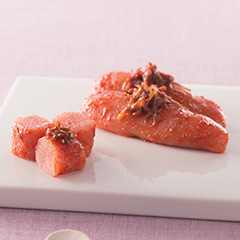 その際立った紅色の身から名がついた紅鮭。主に北太平洋のきれいな自然環境の中で育つため、養殖のできない魚として知られます。しっかりとした身は、塩で締めるほどに余分な水分が浮き出て旨みを増加しコクのある味に。目利きが選りすぐった紅鮭を、塩加減を吟味し、さらに塩をなじませるためにマイナス1℃で24時間寝かせ、熟成させました。一切れずつ真空パックでお届けします。魚の中心部に水分が残るよう、焼き過ぎに注意してお召しあがりください。「日本の極み」TOPへ
