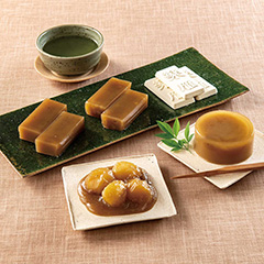 長野県小布施町で栗の栽培が始まったのは室町時代。〈小布施堂〉は小布施に古くから伝わる栗の文化を受け継ぎ、伝えています。栗ならではの香りと甘みを生かした商品づくりには、その土地の歴史と文化がつまっています。さらっと口どけのよい水栗羊羹、自社工場で仕込んだ栗あんと栗粒を合わせた栗鹿ノ子、栗あんだけを使った栗羊羹、栗羊羹に栗粒を加えた栗鹿ノ子羊羹、なめらかな食感で、香ばしい風味の楽雁の詰め合わせです。
