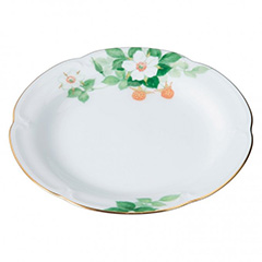 大正8年の創立以来、孤高の地位に君臨する〈大倉陶園〉。世界に“オークラ・ホワイト”として知られる純白の冴え、熟練の技が表現する華麗な絵付けは、高級白磁としての気高さに満ちています。『実を結ぶ』縁起の良い絵柄として好まれている「きいちご」柄のプチケーキ皿。もう少しで赤く熟す頃合いの瑞々しい色使いのきいちごは、お皿の上のお菓子を邪魔しないよう絵柄は少し控えめに配置しております。優雅な白磁レリーフと明るい色合いのハーモニーはおもてなしにもふさわしい器です。