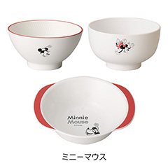 マットホワイトに映える、クラシックミニーのワンポイントデザインがおしゃれな子ども用食器。軽くて丈夫な樹脂製で、電子レンジや食洗機にも対応。ご飯茶碗の内側は米粒が貼り付きにくい形状など、使いやすい配慮も嬉しい。