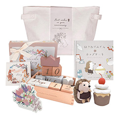 記念撮影からカレンダーまで永く使えるつみきと、ぬいぐるみ付の絵本「はりねずみくんとカップケーキ」のセット。つみきは、日付、身長、体重、時間などが表現できる、4 桁の数字と英語と、それを彩る星と王冠の9 ブロックが入っています。