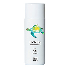 新生児から大人まで安心して使える、UVミルク。ノンケミカル・ノンシリコンで、SPF50+/PA++++の高いUVカット力。石鹸だけで落とせて、海にいるサンゴなど海洋生態系にも優しい処方です。