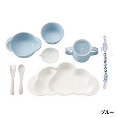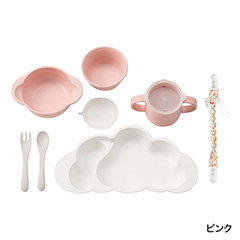 「自分で食べたい!」を応援する食器セット。お食事が楽しくなるかわいい雲の形のプレートは、ごはんがすくいやすい設計で手に馴染むカトラリー付き。多用途に使えるマルチクリップも付属しています。