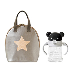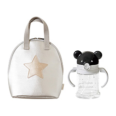 ストローマグとポーチの2点セット。ストローマグは8ヵ月ごろから使用OK。ハンドル部分は折りたたんでコンパクトに持ち運ぶことができます。ポーチは保温保冷素材を使用、マグと一緒に500mlのペットボトルも入ります。