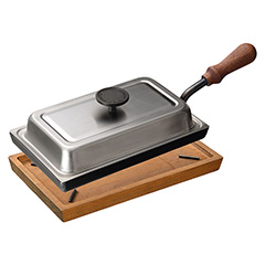 ポンドステーキがぴったり入る「大人の鉄板」シリーズの小サイズ。蓋付きでお肉以外にも海鮮や蒸し野菜も焼くことができます。鉄板4.5mm の厚みで隅々までタップリと熱を蓄え、熱を均一に伝えることで食材本来の旨みを引き出します。また、出来立ての美味しさをテーブルで楽しめるよう、ウッドボートとセットにしており、毎日の食卓を華やかに演出してくれます。