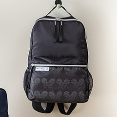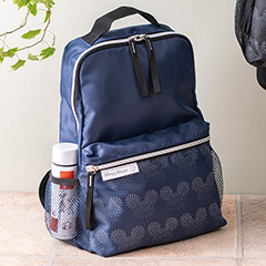 前面のポケット部分にあしらったミッキーシルエットのリフレクター。普段は主張し過ぎず、ちょっとした光の反射でキラッと光って目立ちます。サイドにもドリンクなどを入れられるポケットつきです。軽くて少し小ぶりなサイズなので、女性やお子様にもぴったり!