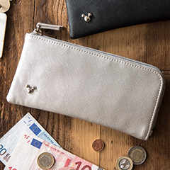 L字のラウンドファスナーで開閉する長財布。後ろポケットや中面のカード収納など、使いやすい収納スペースもたくさん。ポイントにあしらったミッキー形の金具が控えめながらいいアクセントになっています。男女兼用でお使いいただけるカラーをご用意しました。