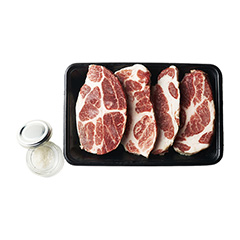 1956年、日本初のイベリコ豚の輸入店として大阪心斎橋に創業した〈IBERICO-YA〉。脂身の甘みが楽しめるイベリコ豚の肩ロースステーキです。イベリコ豚は食べてもお腹がもたれないさっぱり感も特徴で、焼いた後、イタリア産の香り高いトリュフ塩をかけてお召し上がりください。