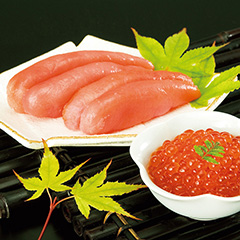 北海道噴火湾産の鮮度の良いすけとうだらの卵を、塩と水だけで漬けあげたたらこと、旬の秋鮭の卵で作ったいくら醤油漬の詰合せです。