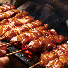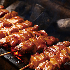 室蘭でやきとりといえば、豚肉+玉ねぎに洋からしを添えるのが定番。やわらかな豚肩ロースを使用、あっさりとした醤油たれで仕上げています。