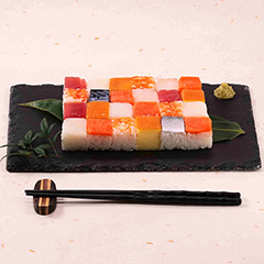 7種の押し寿司が鮮やかに敷き詰められた「海鮮モザイク寿司」。一口ごとに異なる味わいが楽しめるのが魅力です。ご家庭で手軽に彩り豊かなお寿司をお召し上がりください。