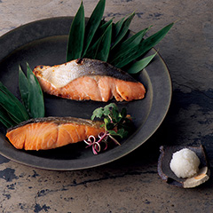 旬の時期である9月に獲れる、北海道オホーツク海産の雄の秋鮭のみに限定し、贅沢な「焼魚」に。うろこの向きに逆らって塩をすり込む逆塩製法により、皮から塩をしみこませ、旨みを引き出しました。「西京焼」は、京都の西京味噌と合わせることで旨みを増幅。電子レンジで温めるだけでお召しあがりいただけます。「日本の極み」TOPへ