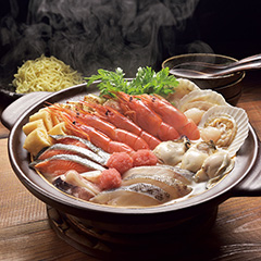 フタを開けた瞬間に目にキラキラと飛び込む海産物の数々。この贅沢な松前漬けには、数の子の他、刺身用ほたてとずわいがに、たこ、いくら醤油漬並び、粘りを出すため「がごめ昆布」で和えています。漬け出汁の深みある風味に数の子をはじめとする魚介がよく馴染みます。