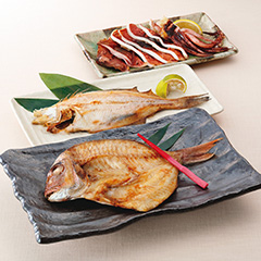 庄内浜で水揚げされた魚介の干物を、便利な真空パックでお届けします。刺身でも食べられる高い鮮度の真いか(するめいか)を素早くさばき、半乾干しでソフトに仕上げた「いか一夜干し」。肉厚で脂がのっていながら淡泊な味わいの宗八カレイを塩干しし、旨みを凝縮した「宗八カレイ干し」。庄内の荒波で育った天然真鯛を頭付きで干しあげた「真鯛開き干し」のセット。浜の母ちゃんが手作業で丁寧に製造する、潮の香りも豊かな日本海のお宝を味わってください。「日本の極み」TOPへ