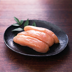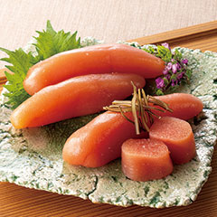 ベーリング海で漁獲されるすけとうだらの卵を洋上にて取り出し、急速冷凍しているため、鮮度の高いまま加工されます。「大吟醸仕込」は、福岡で一番古い酒蔵(大賀酒造)の大吟醸酒と羅臼昆布の旨みが入った調味液にじっくり漬け込み、華やかな芳香と丸みのある深い味わいが楽しめる味付けたらこに仕上げました。「昆布風味」は、細切りの北海道産羅臼昆布を合わせて旨みを増幅させた味付けたらこです。2種類とも着色料不使用の無着色たらこで、一粒一粒が際立った食感が魅力です。「日本の極み」TOPへ