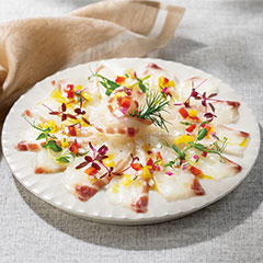 氷見市の老舗魚問屋により、北海道産の良質な脂ののったぶりの表面を炙り、芳ばしさをのせたひと品に仕上げました。外側は香ばしく、中は生の状態に仕上げたぶりは、ポン酢をかけてたたきにしても、カルパッチョにしてもお楽しみいただけます。お好みの厚さにスライスしてお召しあがりください。「日本の極み」TOPへ
