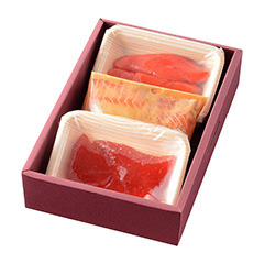 昭和21年創業、新潟の魅力あふれる、美しき日本料理を提供する〈料亭かも川本館〉。越後味噌の旨みを存分にしみ込ませ、ふっくらとジューシィな味わいの「佐渡サーモンの味噌漬」、味わい深い「塩たらこ」、まろやかでくせのない塩味がおいしい「筋子の塩漬け」の3色セットです。