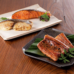 大井川の伏流川で餌止めをして臭みをとった活うなぎを、特製だれにつけ遠赤外線加熱でじっくり焼きあげました。西京漬は、大きく厚みのある切身を、甘みのある特製味噌にしっかり漬け込み、魚の旨みを引き出しました。「日本の極み」TOPへ