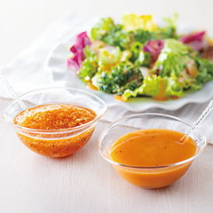 すりおろしにんじんの風味と甘さが人気のにんじんドレッシングと、みじん切りの歯触りがよいたまねぎドレッシングのセット。