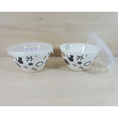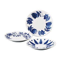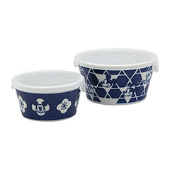 ミッキーマウスと仲間たちのすました表情のフェイスアートが、松皮菱、破れ籠目、梅といった日本の伝統和柄と組み合わされ、呉須(ごす)の深い色合いで表現した器です。