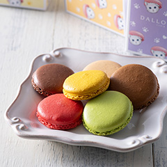 フレンチメレンゲで作られる、ぷくっと膨らんだ厚みのある形が〈ダロワイヨ〉のマカロンの特徴です。「ピエ」と呼ばれるフチに押し出された生地は、かわいらしいフリルのようにも見え、中には素材の味を活かしたジャムやコンポート、果実のピューレを使用したクリームが詰まっています。定番6種の詰合せは、贈り物にぴったりです。