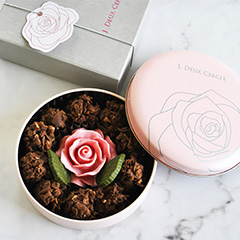まるで花束をそのまま閉じ込めたかのようなに咲き誇る可憐なローズはフランス産のチョコレートを使用し、ベリーのフレッシュで甘酸っぱい、ひと口で心ときめく味わいに仕立てました。その周りを囲むのは、ラングドシャを練りこんだサクサク軽やかなチョコクランチ。深みのあるシックな色合いと上品な佇まいが、ローズの華やかさを一層引き立てます。芳醇で奥深い味わいと可憐な美しさが織りなす、バレンタインだけの特別な一品です。